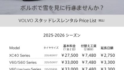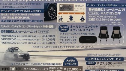 こんにちは!ボルボ・カー千種アテンダントです。スタッドレスタイヤレンタルサービスのご案内です。今シーズンから、スタッドレスタイヤのレンタルサービスを開始いたしました!普段は使わないけれど、旅行の時だけ使いたい!などという方におすすめです。必要な時...