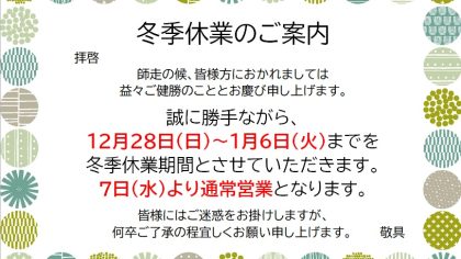 こんにちは!ボルボ・カー千種アテンダントです。冬季休業のお知らせです。12/28(日)〜1/6(火)までを冬季休業期間とさせていただきます。1/7(水)より通常営業となります。ご迷惑をおかけいたしますが、何卒ご了承の程宜しくお願い申し上げます。