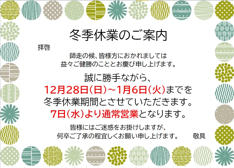 冬季休業のお知らせです。 12/28(日)〜1/6(火)までを冬季休業期間とさせていただきます。 1/7(水)より通常営業となります。