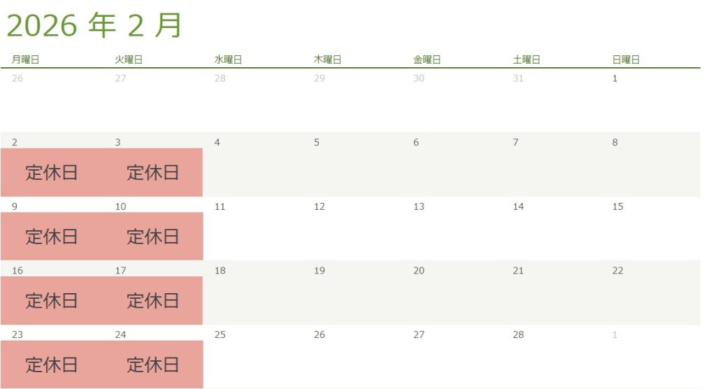 さて、本日は2月の定休日のご案内です。 毎週月曜日と火曜日を定休日としてお休みいただきます。 ご迷惑をおかけしますが、何卒ご理解の程よろしくお願いいたします。