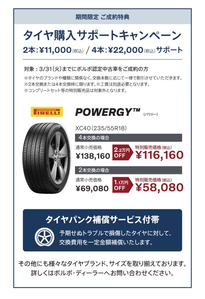 さらに、3/31(火)までにボルボ認定中古車をご成約の方へタイヤ購入サポートキャンペーン実施中です!